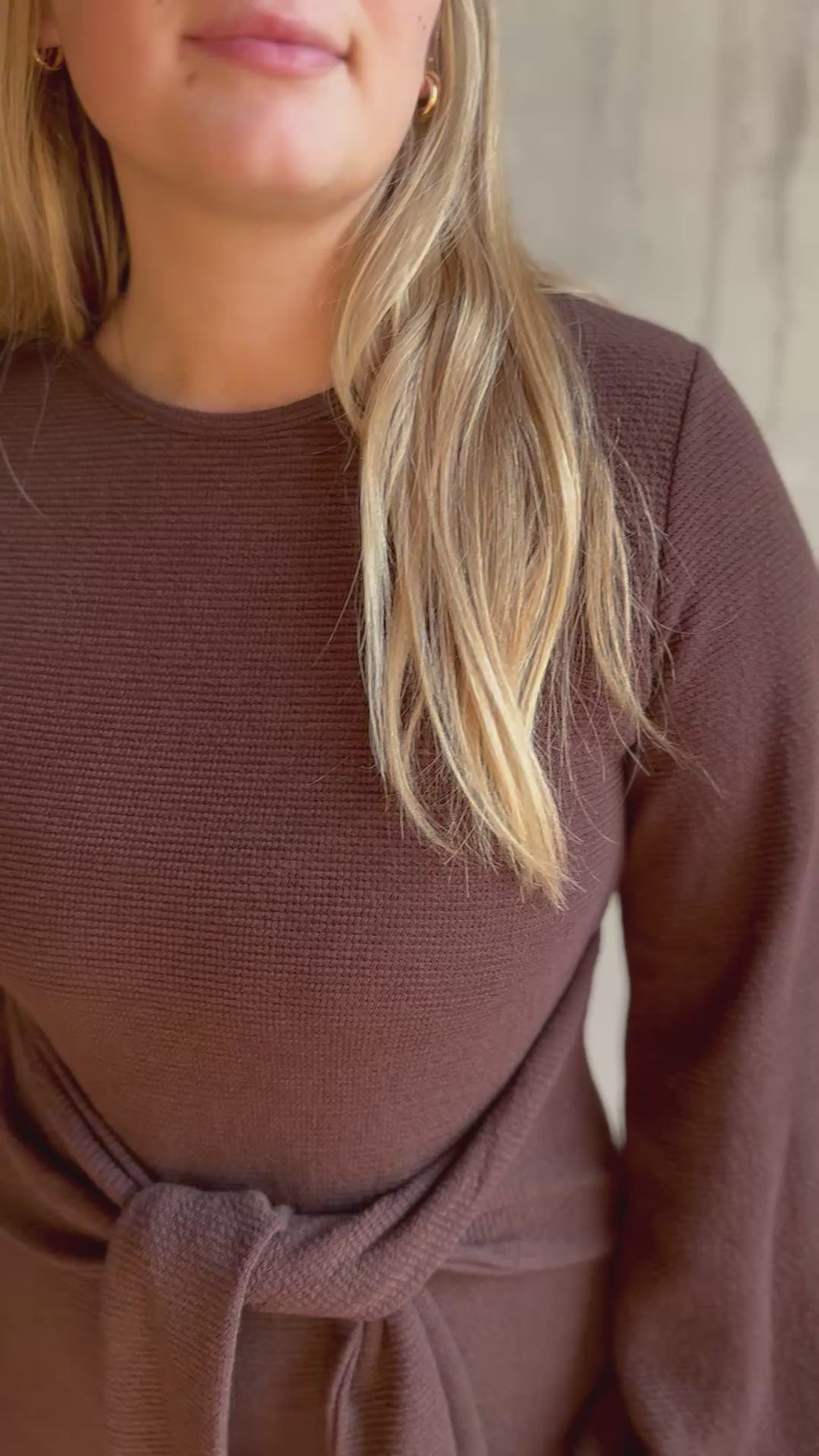 This dress is the perfect mix of playful and polished. The textured seersucker fabric creates visual interest, while the tie-front waist lets you define your shape just how you like it. Balloon sleeves add movement and charm, making this dress a standout choice for events, dinners, or a casual day styled with boots. The chestnut brown tone feels earthy and chic, flattering in every season.