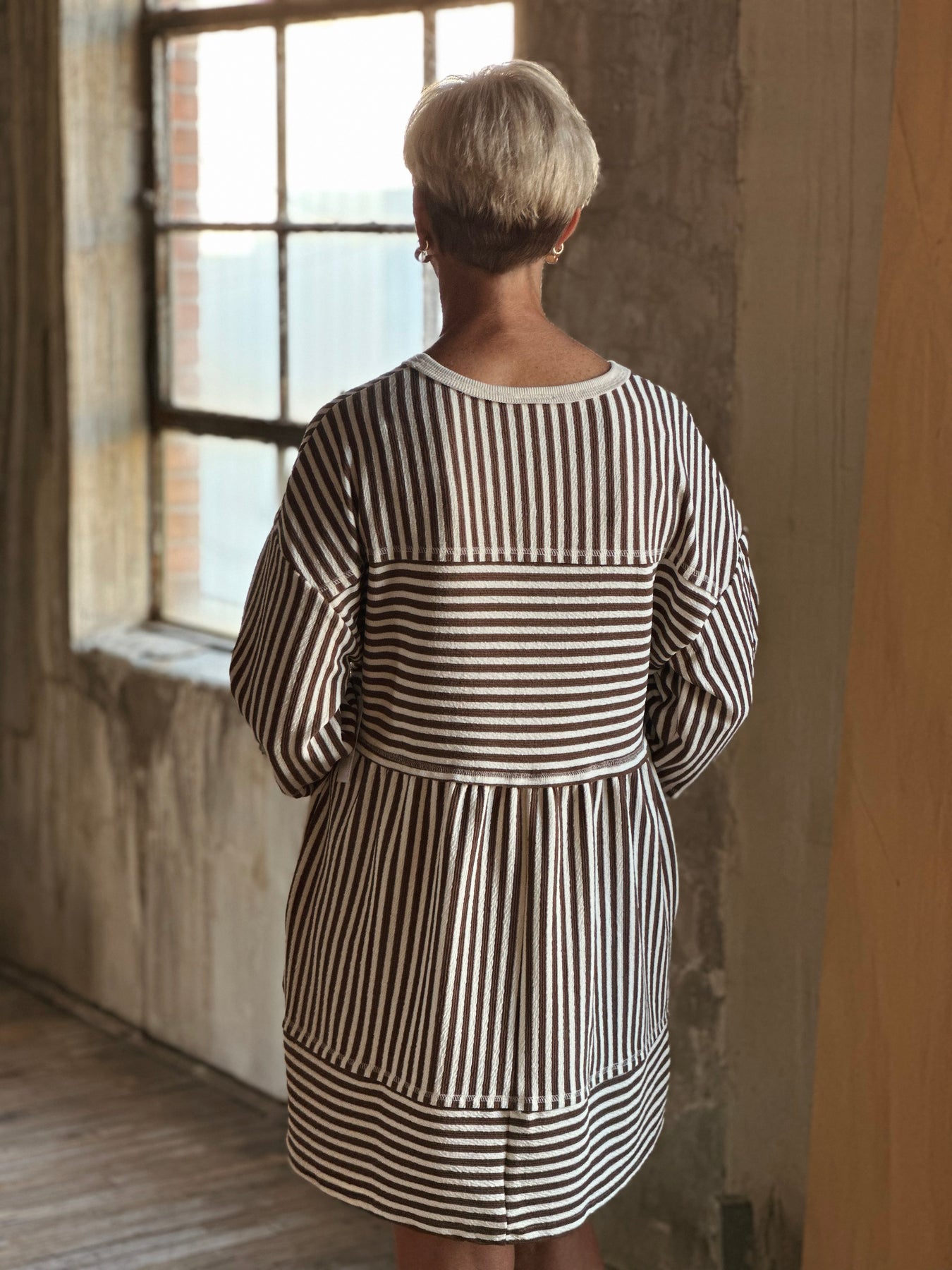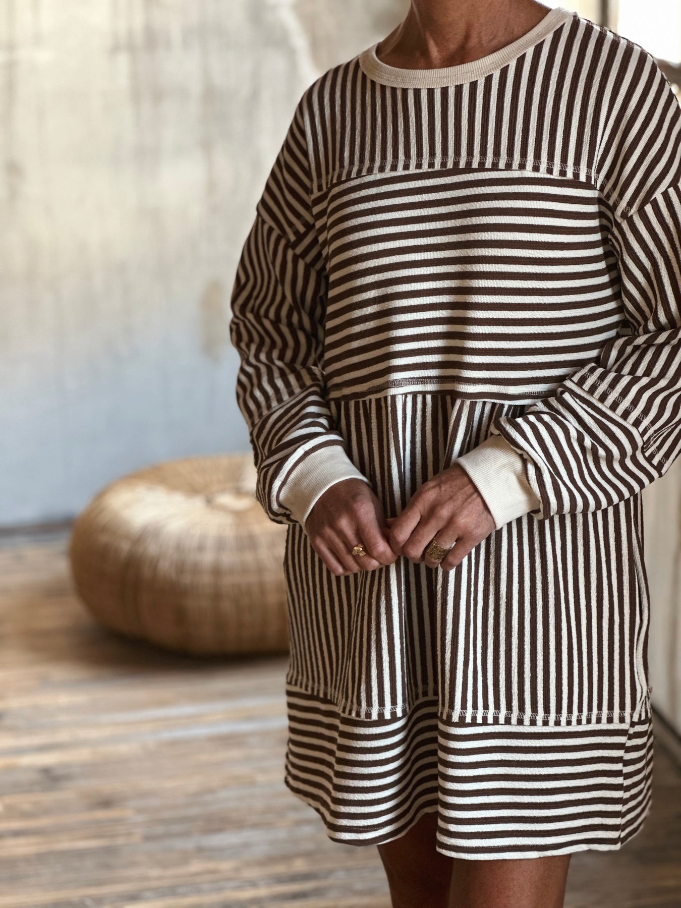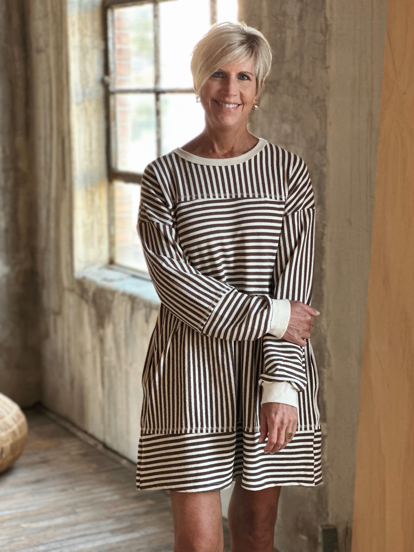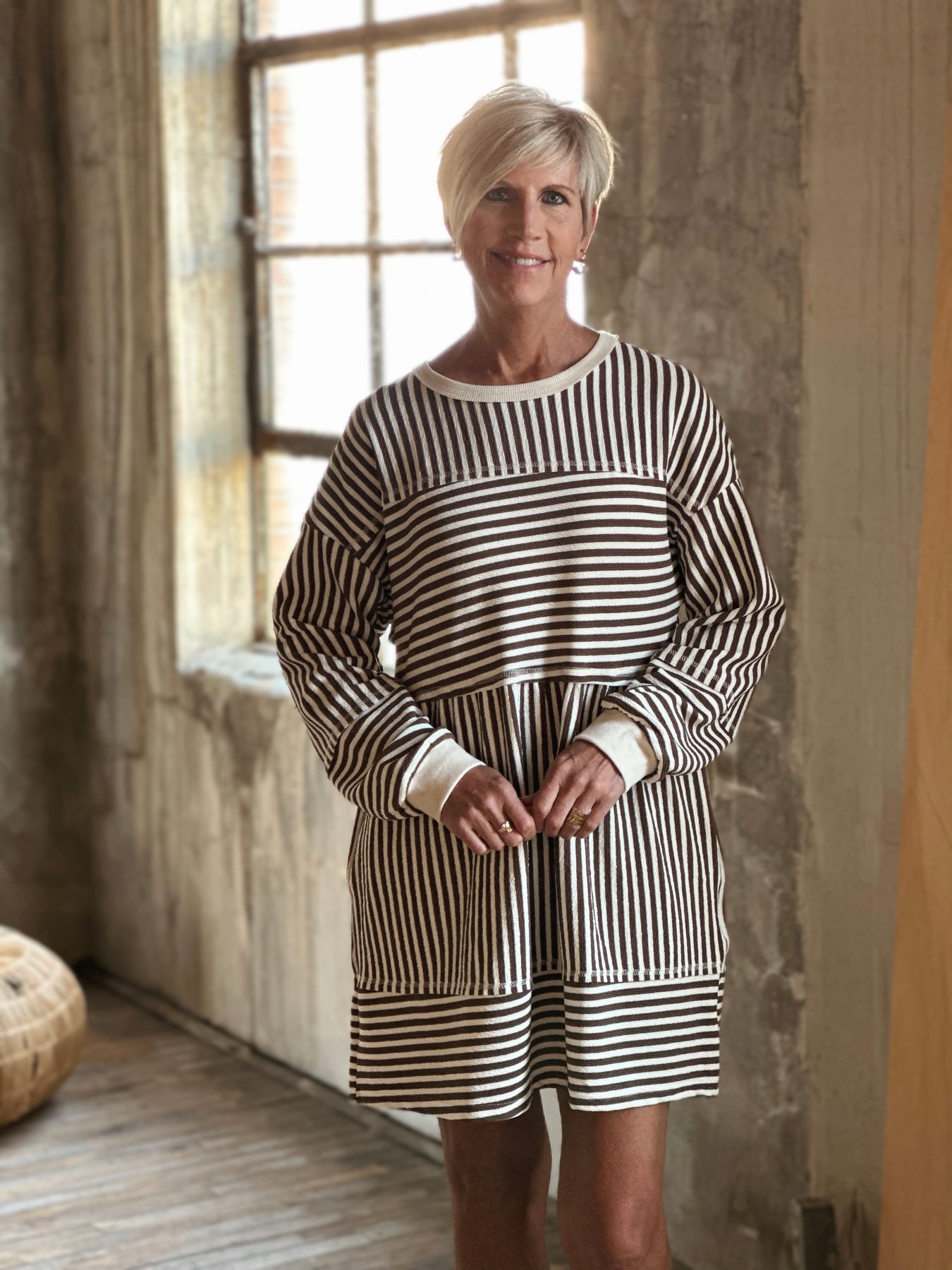 This striped mini dress is the definition of casual comfort with style. The oversized fit and drop shoulder give it that effortlessly relaxed feel, while the mocha stripe pattern keeps it timeless and versatile. Easy to throw on and go, it’s the perfect option for running errands, weekend outings, or casual get-togethers. Pair with sneakers for a sporty vibe or booties for a polished finish.
