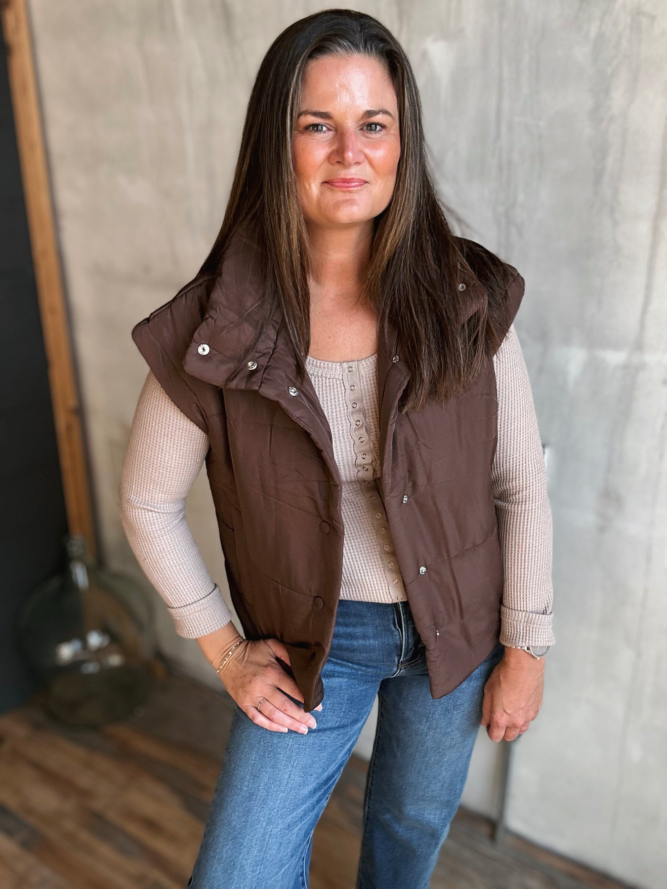 Oversized Snap Button Puffer Vest – Brown