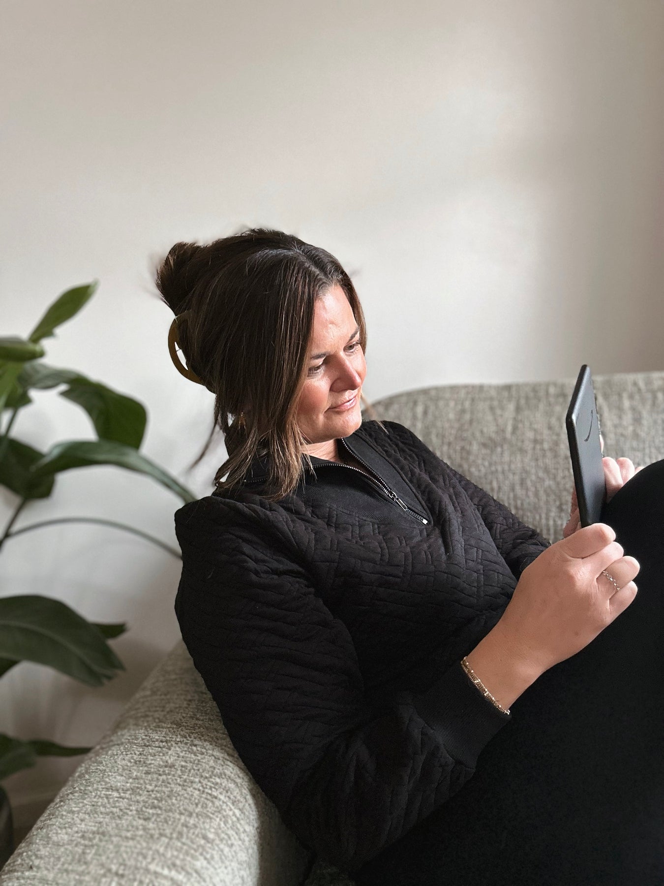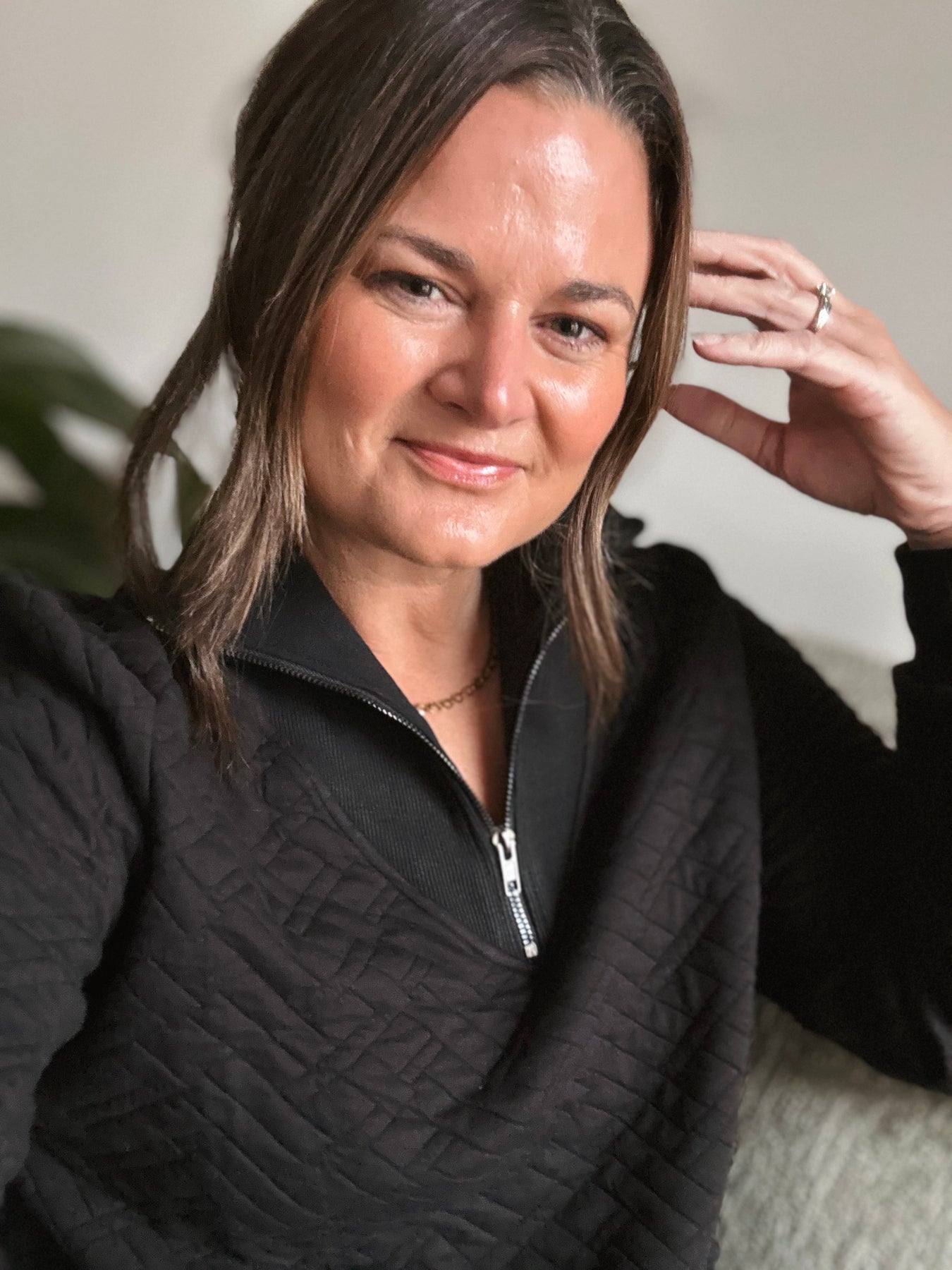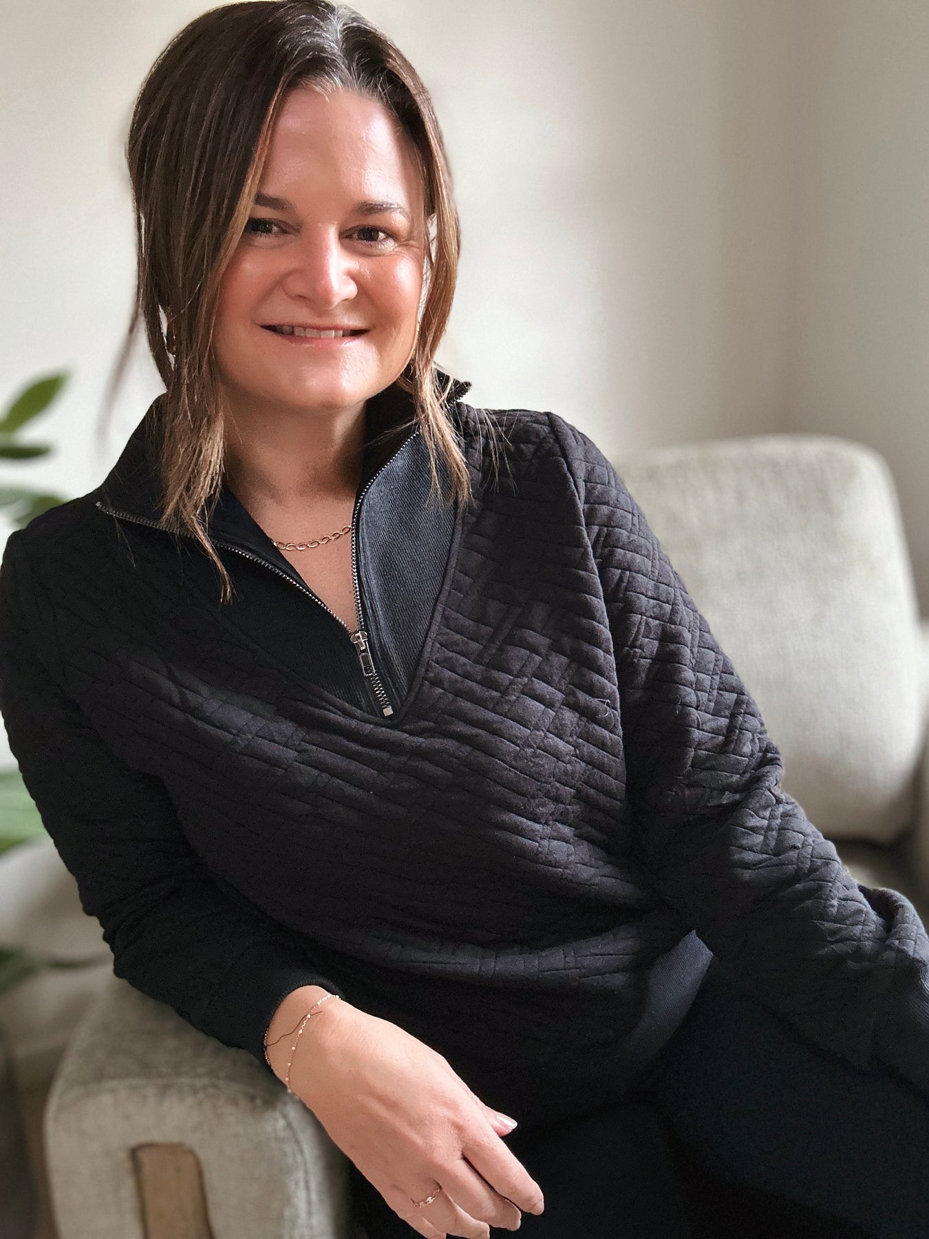 I love the texture on this one—it's cozy without being bulky. The black is a great basic, and the half zip gives you room to play with styling. True to size works great, with enough room for layering underneath.