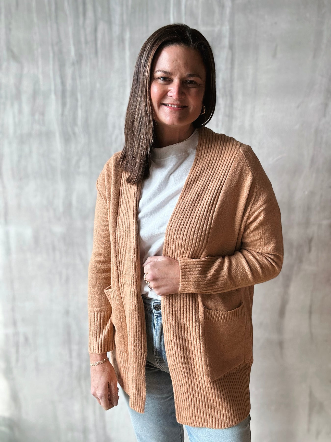 Ribbed Front Sweater Cardigan with Pockets – Camel