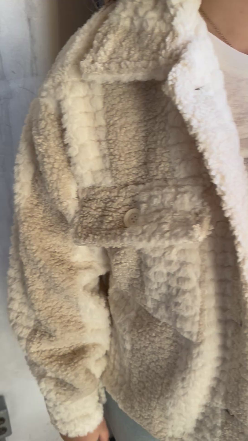 Woman wearing a beige sherpa jacket standing against a neutral background