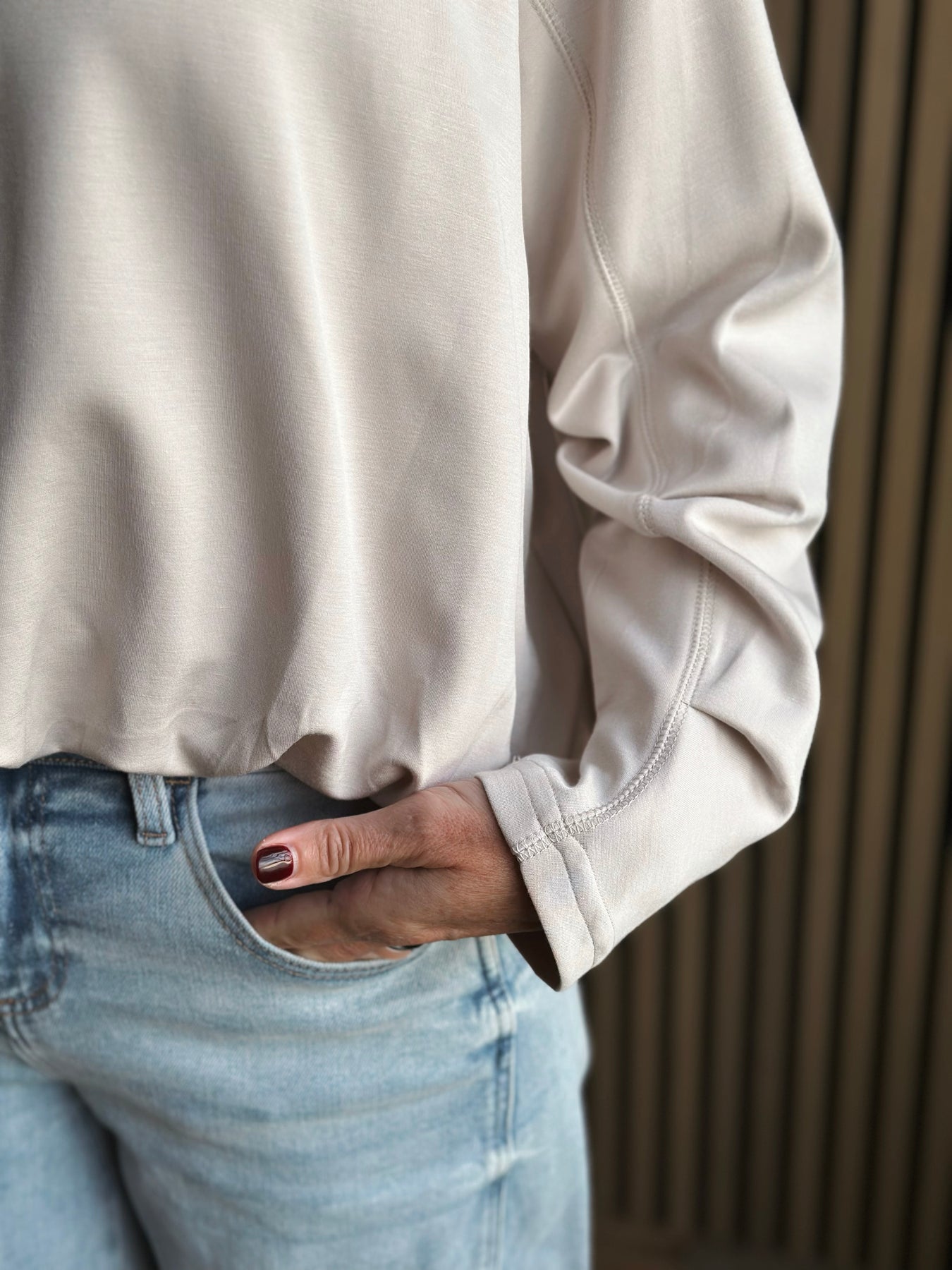 A modern twist on a classic long sleeve, this bubble hem top adds soft structure and effortless style to any outfit. The ruched high-low hem creates a flattering, billowy silhouette that pairs beautifully with high-rise denim or tailored bottoms. Lightweight, comfortable, and subtly elevated—this is one of those pieces that looks chic without even trying.