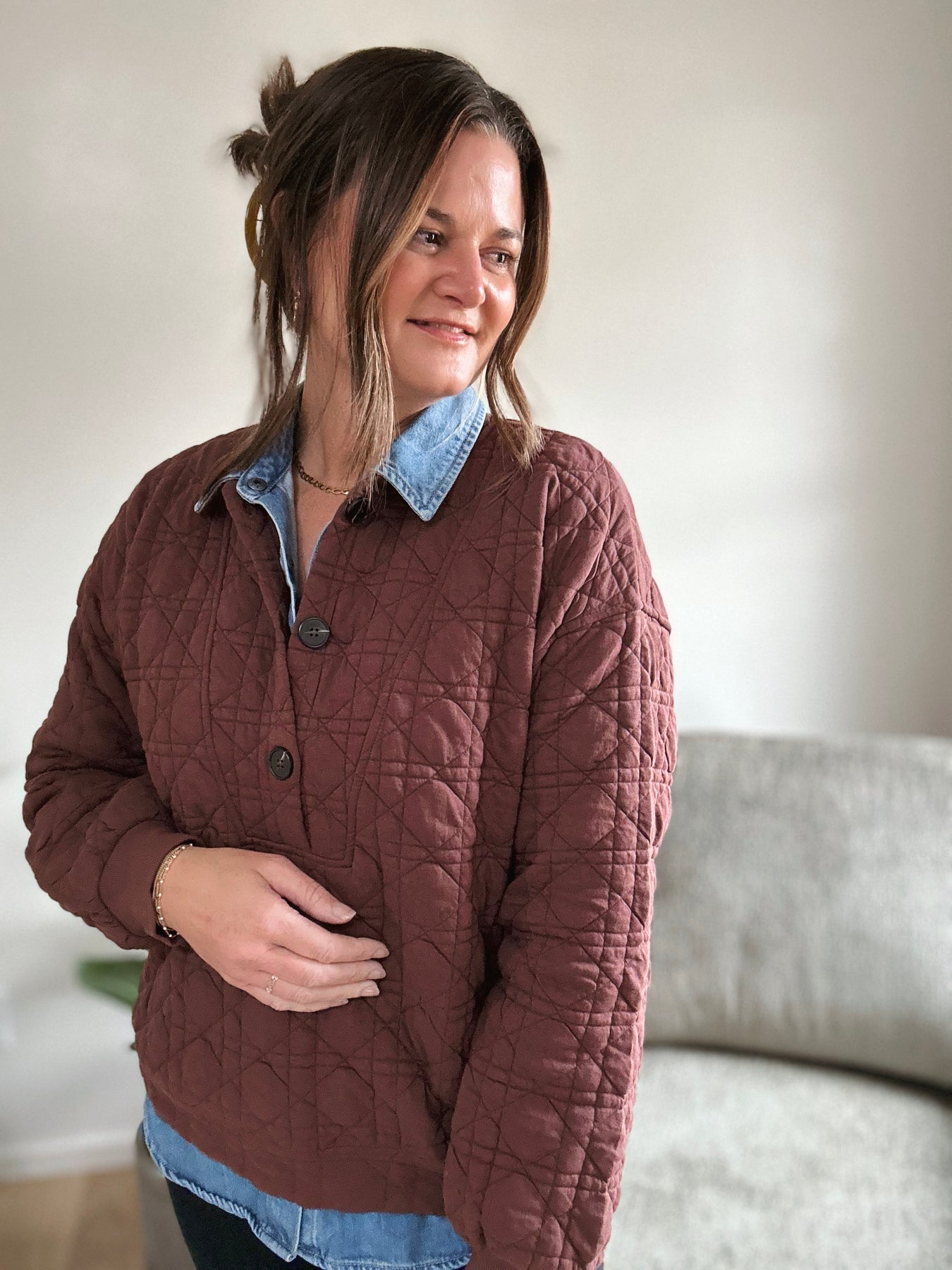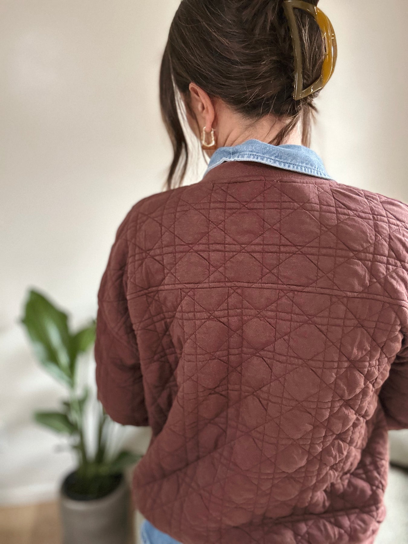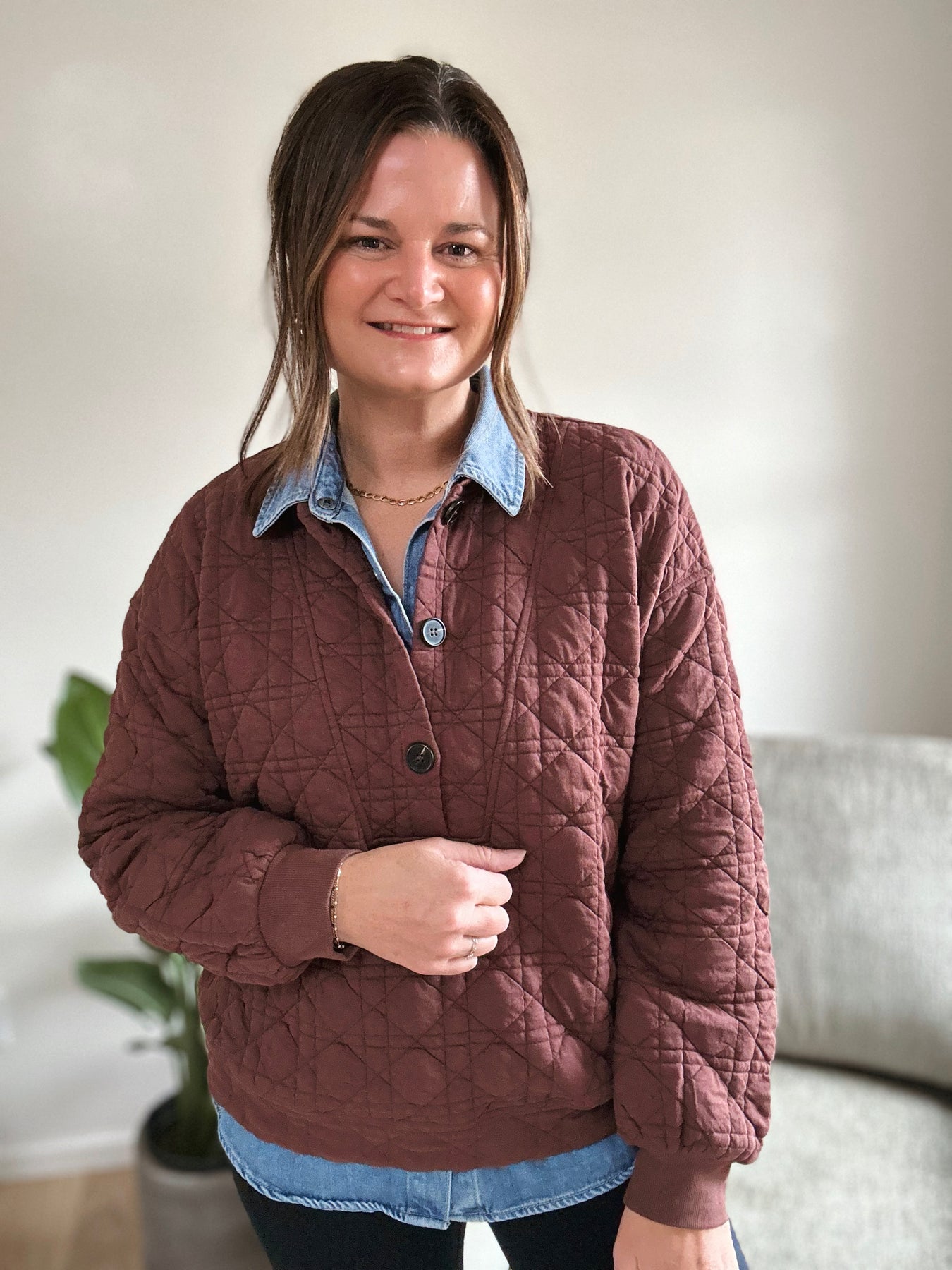 Effortlessly cozy with a polished twist, this quilted jersey sweatshirt brings texture, warmth, and everyday style together. The oversized buttons elevate the look just enough, while the relaxed drop-shoulder fit makes it easy to throw on and go. It’s that perfect in-between piece—comfortable like your favorite sweatshirt but refined enough for casual outings, errands, or a cozy day at home.