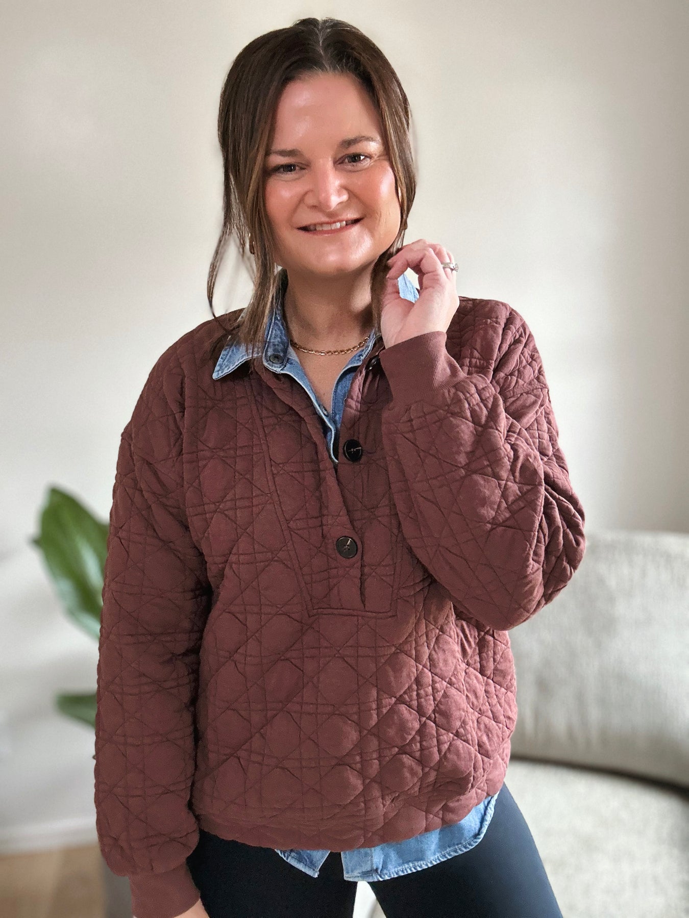 The espresso color is gorgeous and feels like a rich neutral that works with everything. The buttons give it a fun, elevated touch, and the quilted texture makes it feel both cozy and polished. True to size gives you that relaxed, comfy fit without being too oversized.