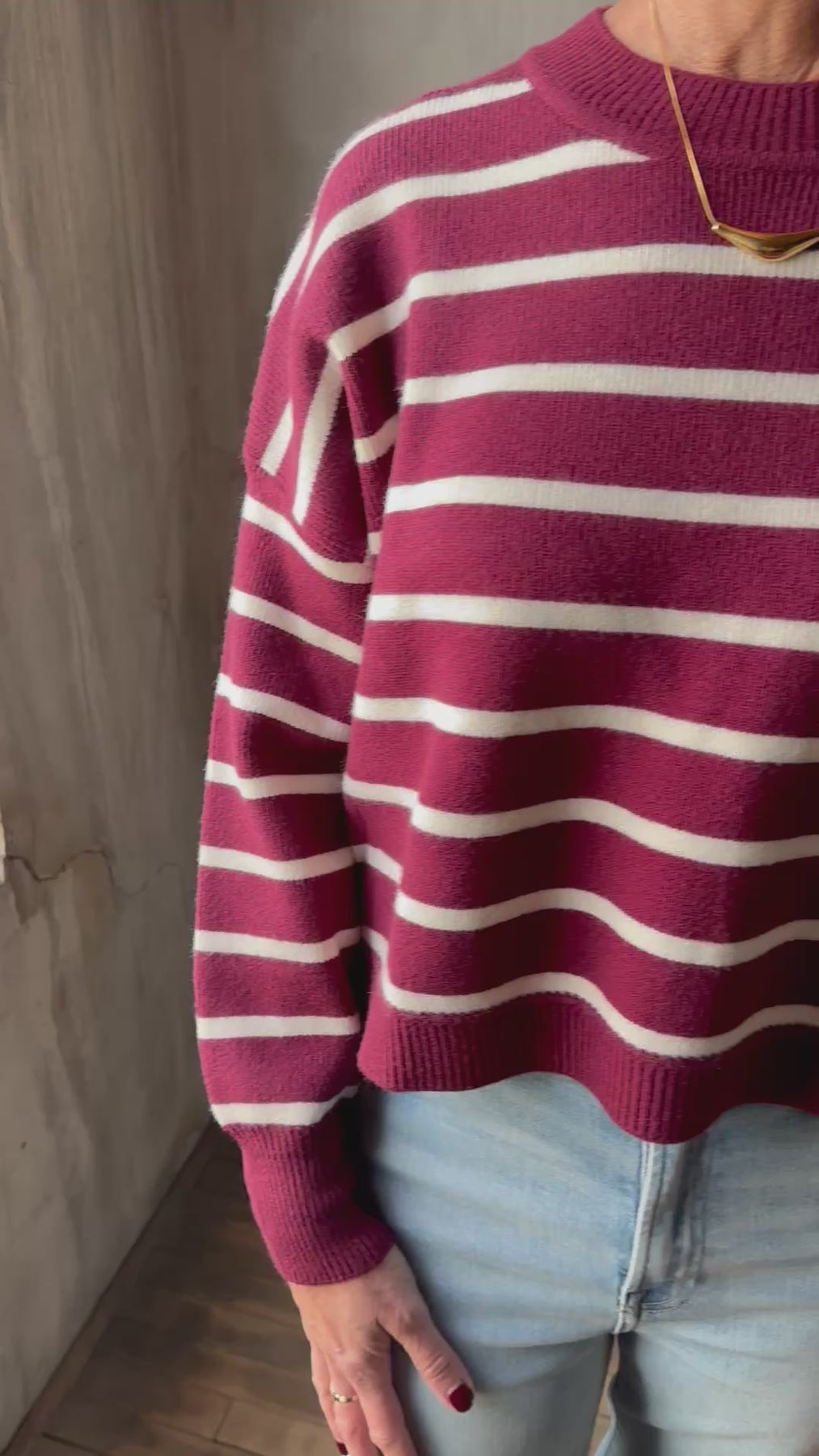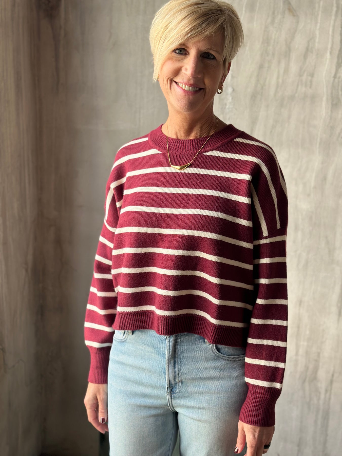 A fun, modern take on a classic stripe. This cropped sweater blends bold burgundy and ivory striping with a soft knit feel, giving you a stylish piece that’s easy to throw on and instantly elevates your outfit. Lightweight yet cozy, it’s the perfect balance of playful and polished.