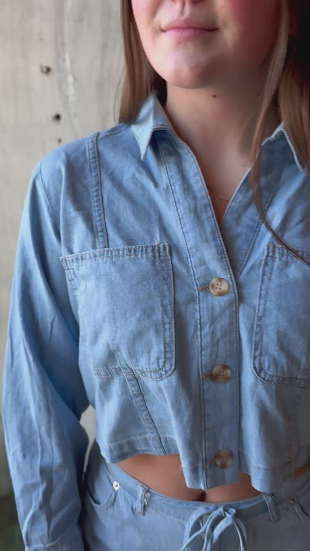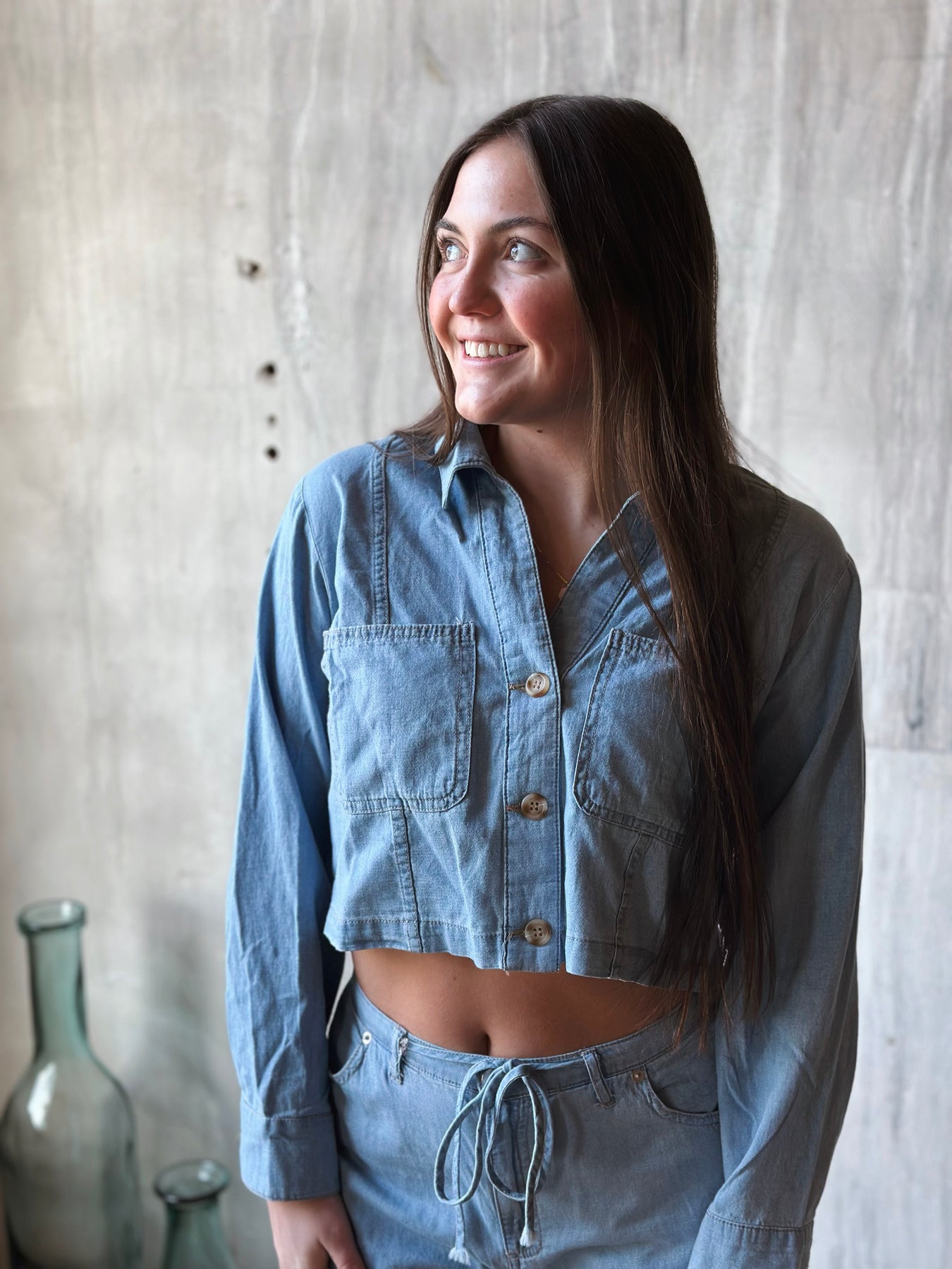 This washed denim woven top brings a relaxed, modern feel to an easy everyday layer. Designed with a classic collar, button-down front, and long sleeves, it balances structure with softness. The cropped length and adjustable drawstring hem give it a laid-back shape that’s flattering and effortless. It’s designed to pair perfectly with the Better Together Pants, sold separately, for a coordinated look that feels comfortable and pulled together.