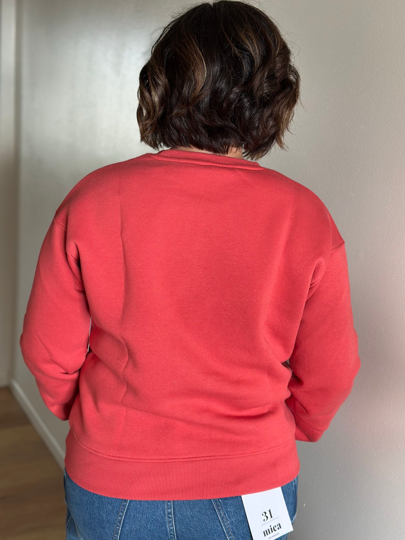 This is such a good staple sweatshirt. The inside is super soft, and the fit is classic—not oversized, not cropped—just easy and wearable. The brick color is really flattering and feels a little more special than your basic neutral.
