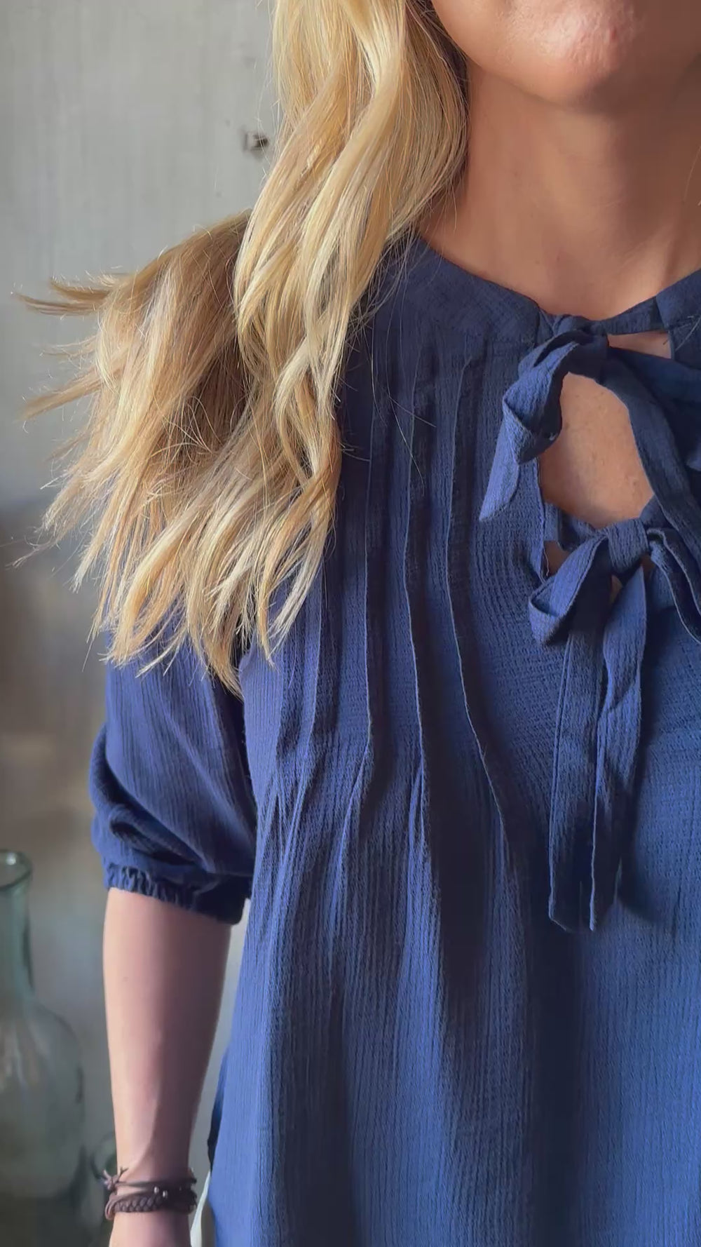 Woman wearing a light gray blouse with a tie detail in front of a neutral background