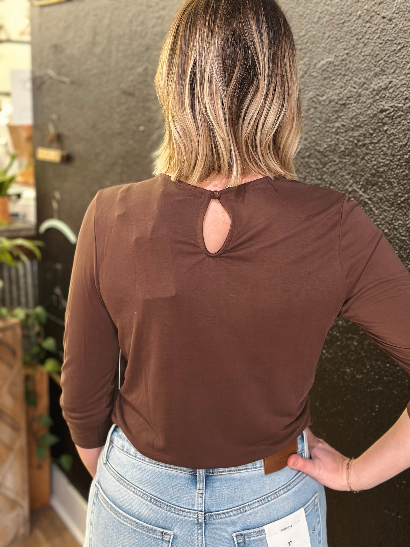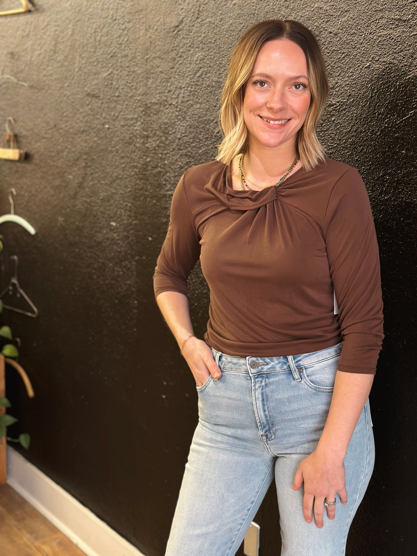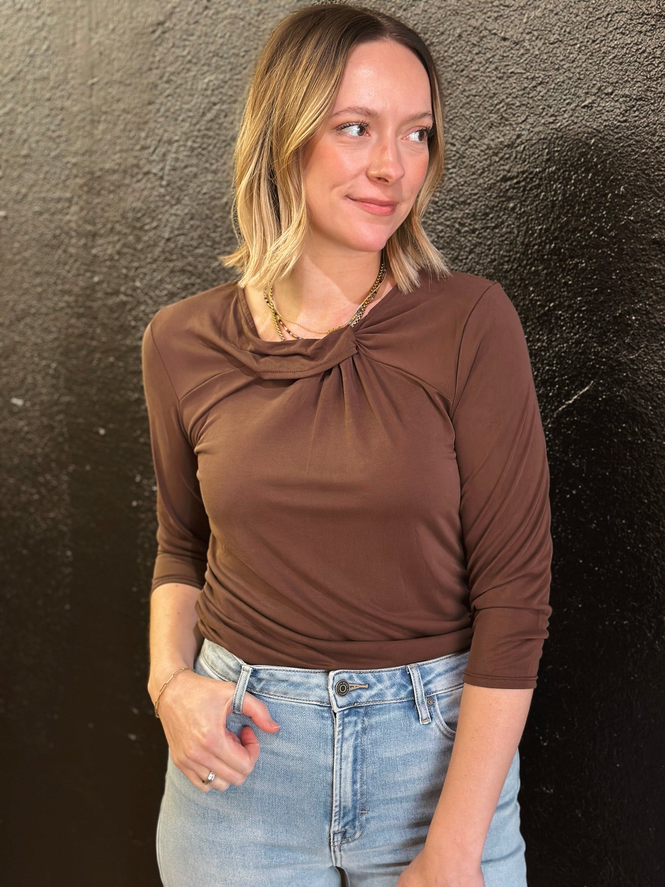 Twist Neck 3/4 Sleeve Side Shirring Top – Chocolate Brown