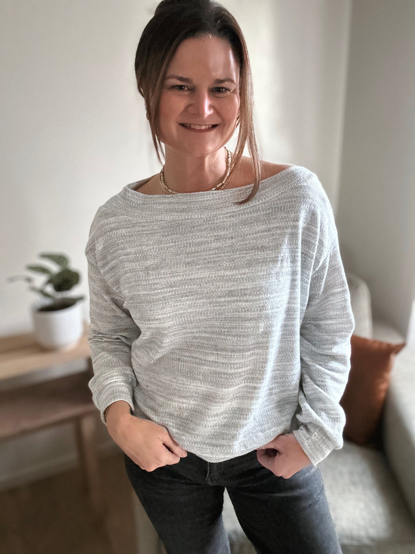 The neckline on this top is so flattering—and it stays in place! It has a comfy, relaxed feel with the right amount of stretch. I wore my true size medium and loved how easy it was to style with just about anything.