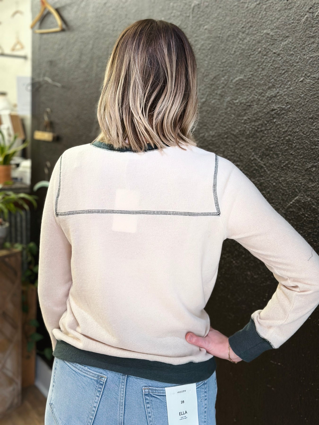 Long Sleeve Band Contrast Reverse Stitch Top – Cream & Green