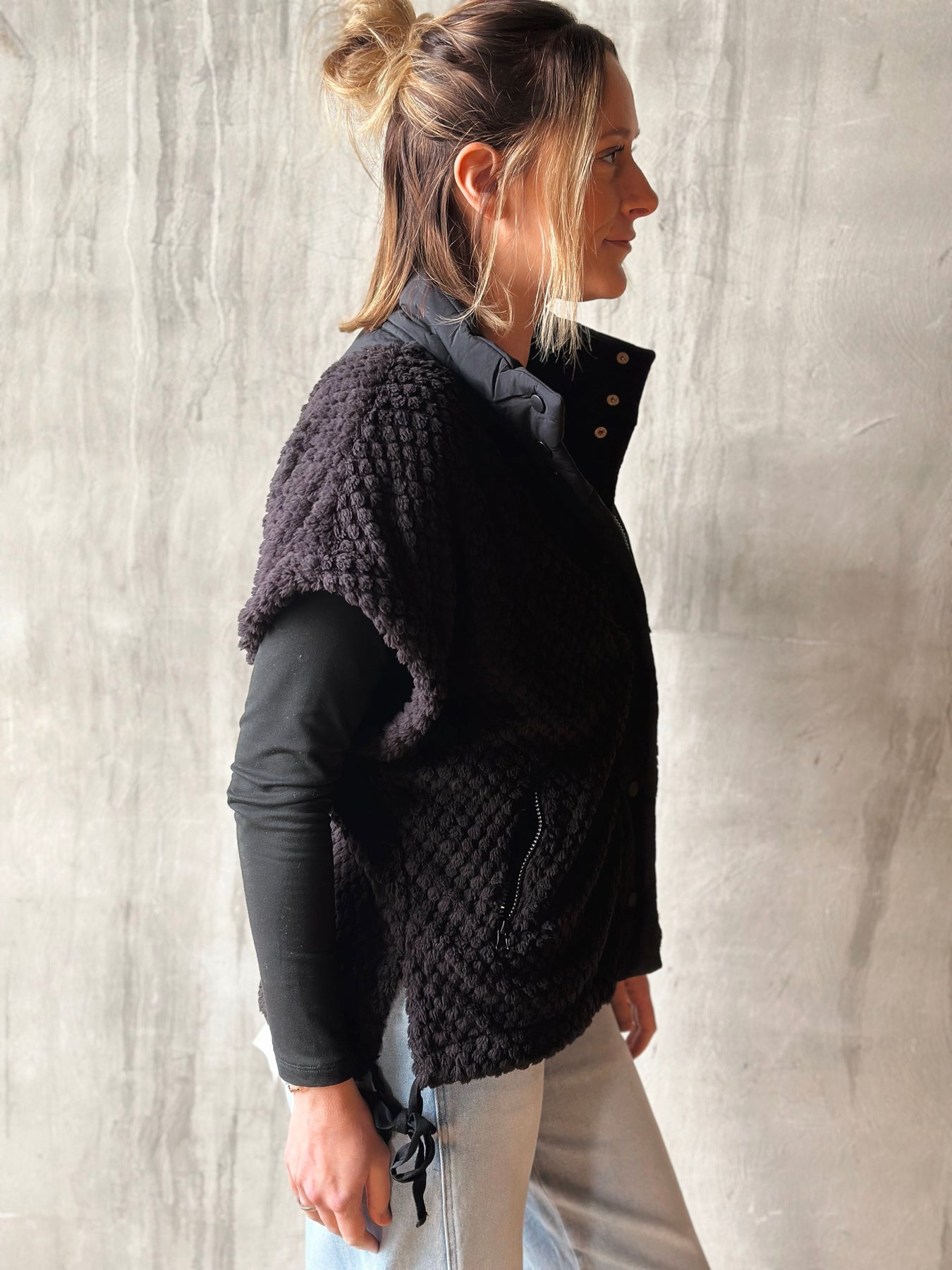 Woman wearing a black textured vest over a black shirt against a light background