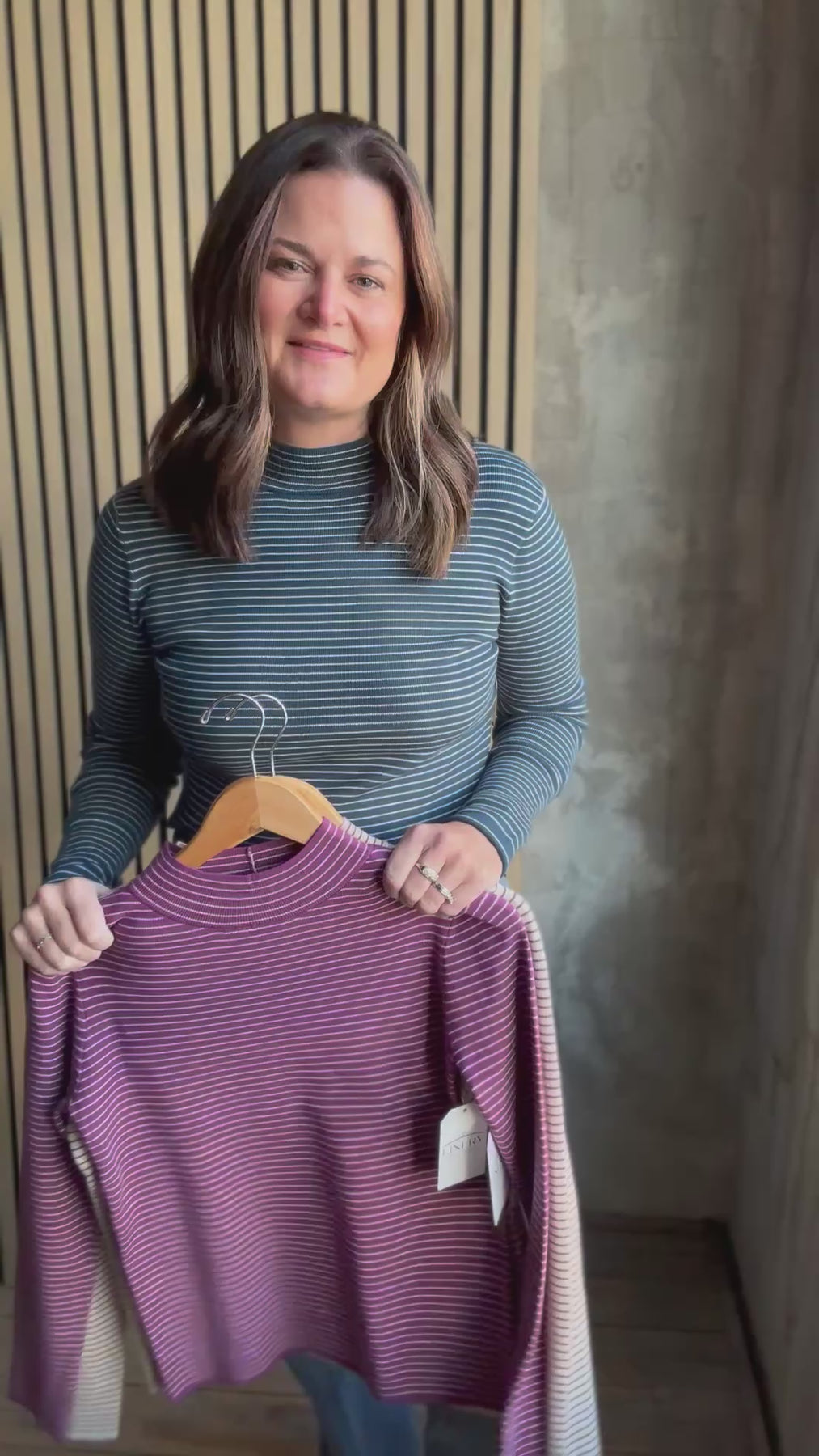 Lightweight, chic, and versatile—this pinstriped mock neck sweater is the perfect layering piece for cooler months. The slim silhouette and classic stripe design make it easy to dress up or down, while the mock neck adds just the right touch of sophistication.