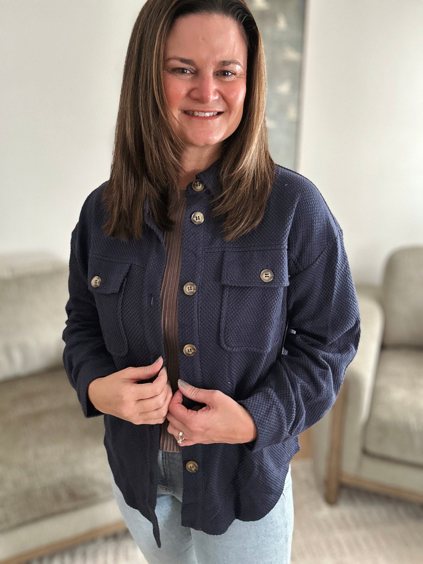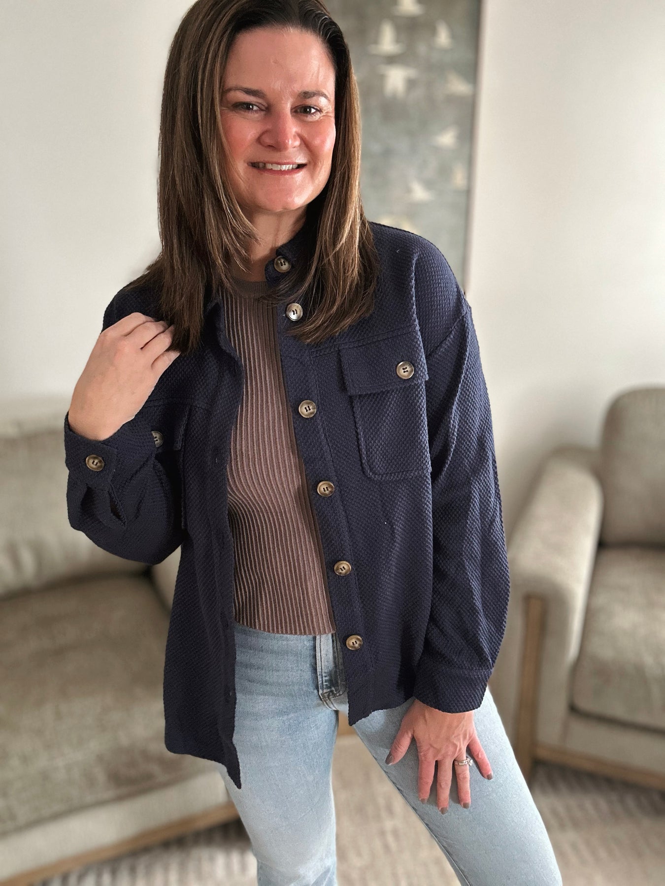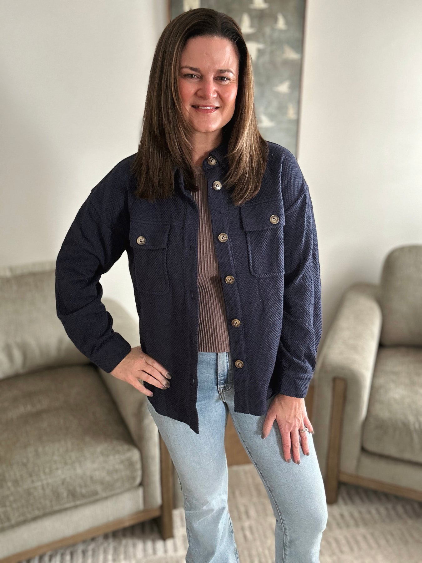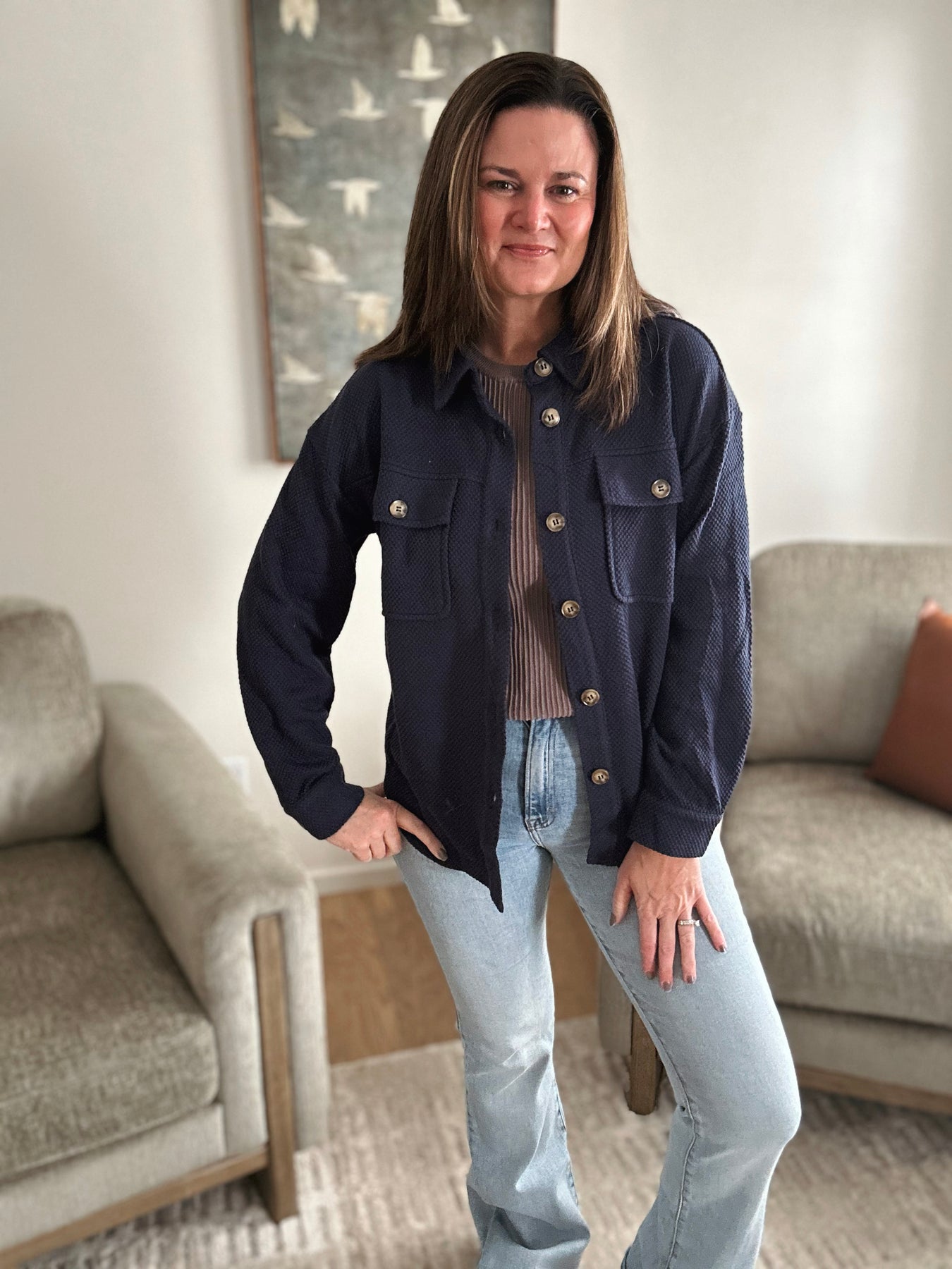 This is such a good everyday layer. The texture really elevates it, and the navy is a classic you’ll reach for constantly. It has enough structure to feel put together but still feels comfortable and easy to wear—perfect for workdays or weekend errands.