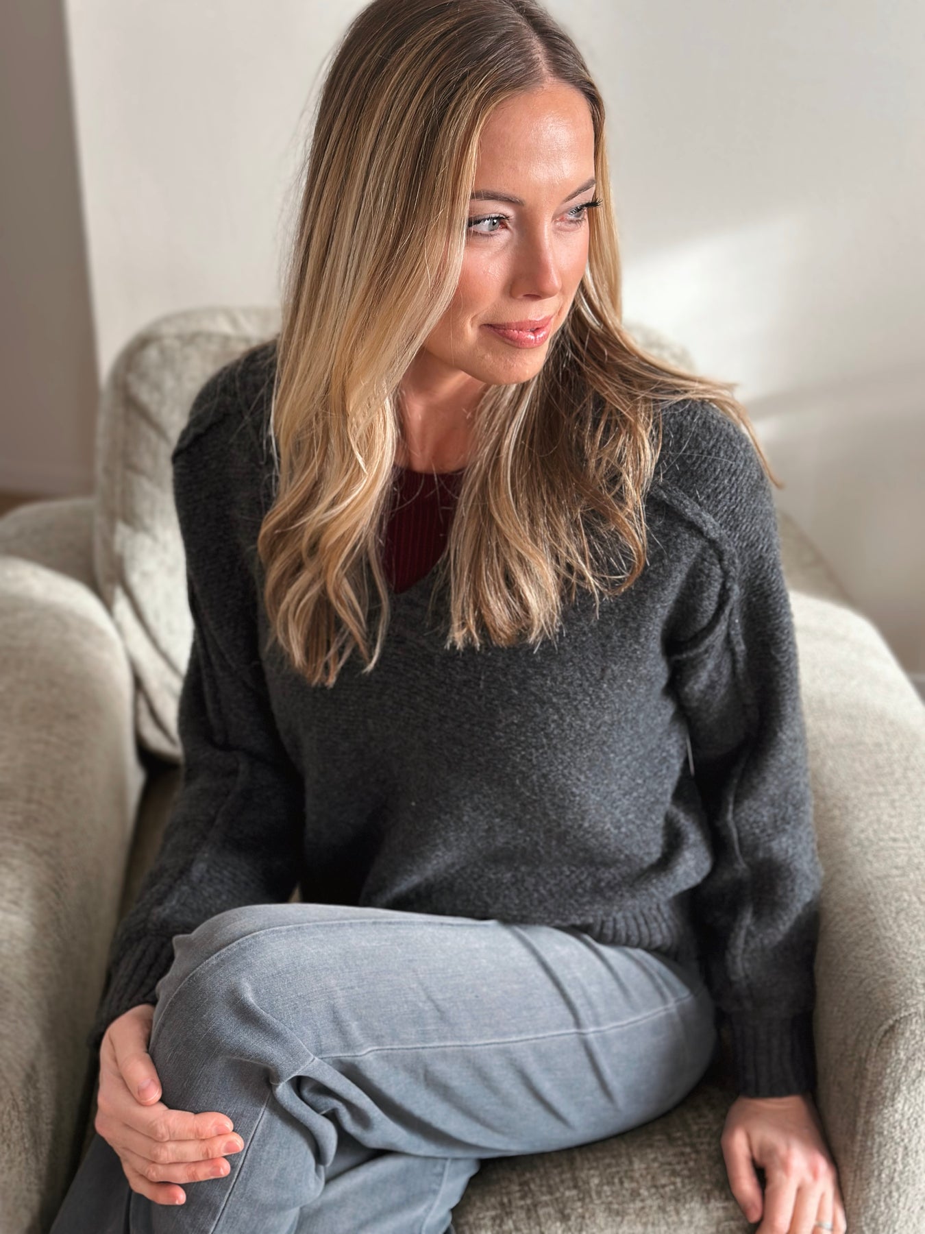This charcoal V-neck sweater is one of those effortless, everyday pieces you’ll reach for constantly. The deep ribbed neckline adds a flattering, feminine touch, while the soft knit and relaxed silhouette keep it comfortable and easy to style. Lightweight enough for layering but warm enough to stand alone, it’s a timeless staple for your fall and winter wardrobe.